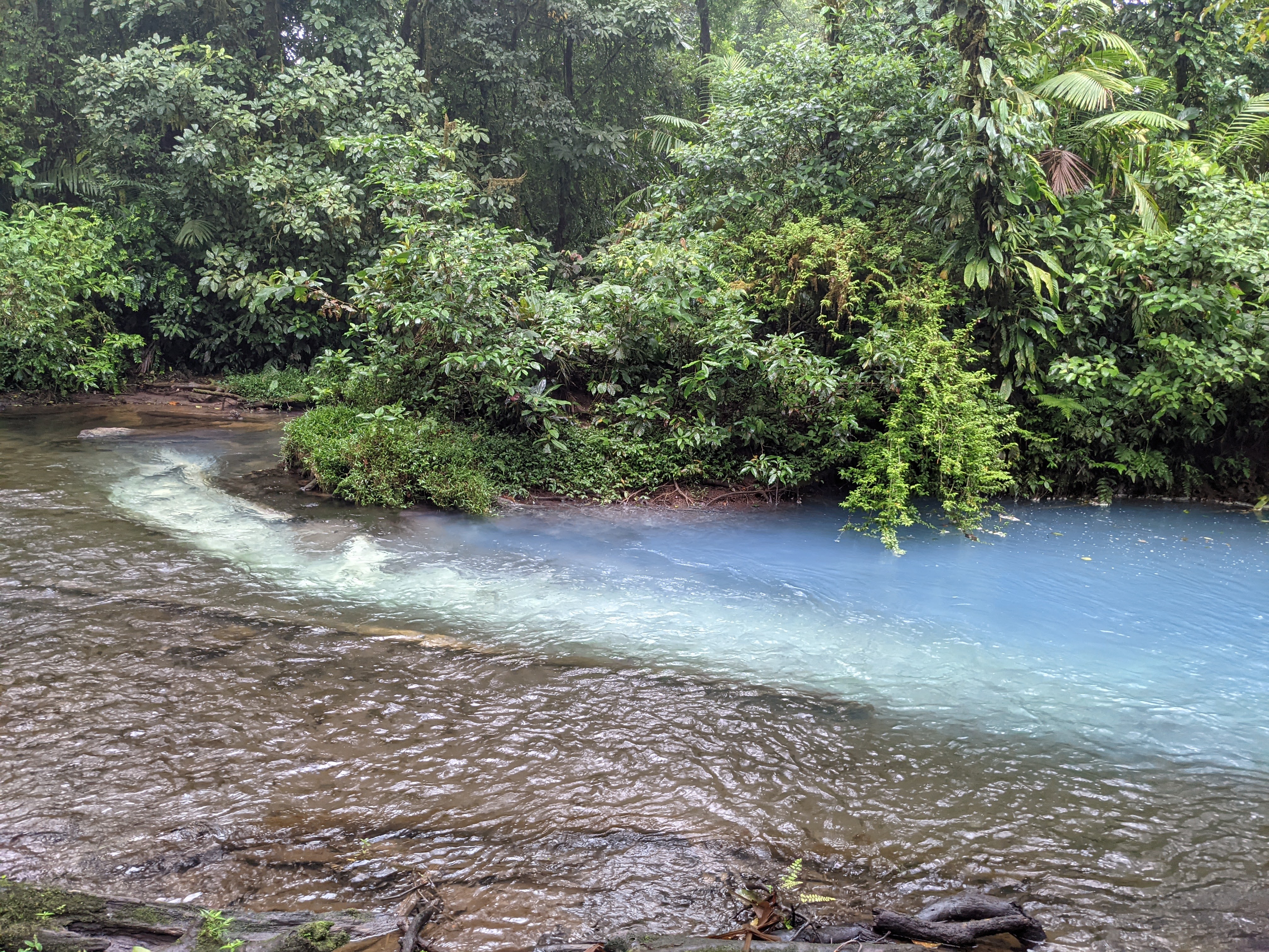 La réalité est un peu moins poétique puisque cette couleur bleue est le résultat d’un phénomène optique: la rencontre du Rio Buenavista avec le Quebrada Agia au PH acide, a pour effet d’augmenter la taille des particules de silicates d’aluminium dont il est chargé. Une partie de ces particules sédimente et l’autre partie reste en supension reflétant la lumière du soleil et l’eau nous apparaît donc bleue.