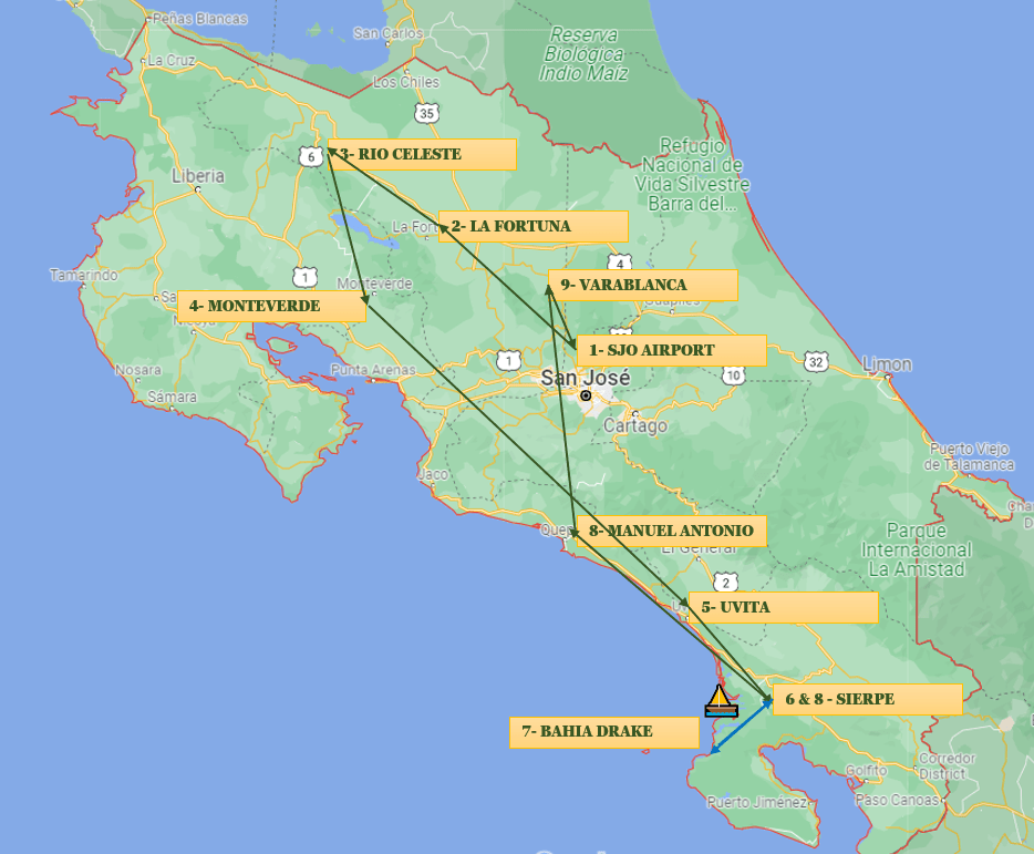 - Trajet: Bahia Drake à Sierpe (1 heure de bateau) puis Sierpe à Manuel Antonio (1 hr 49)