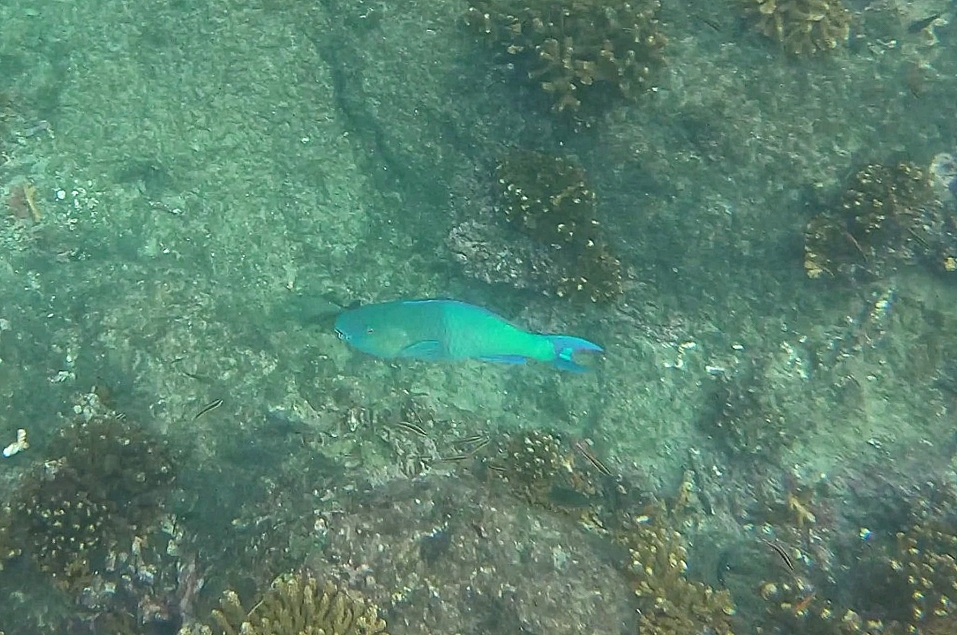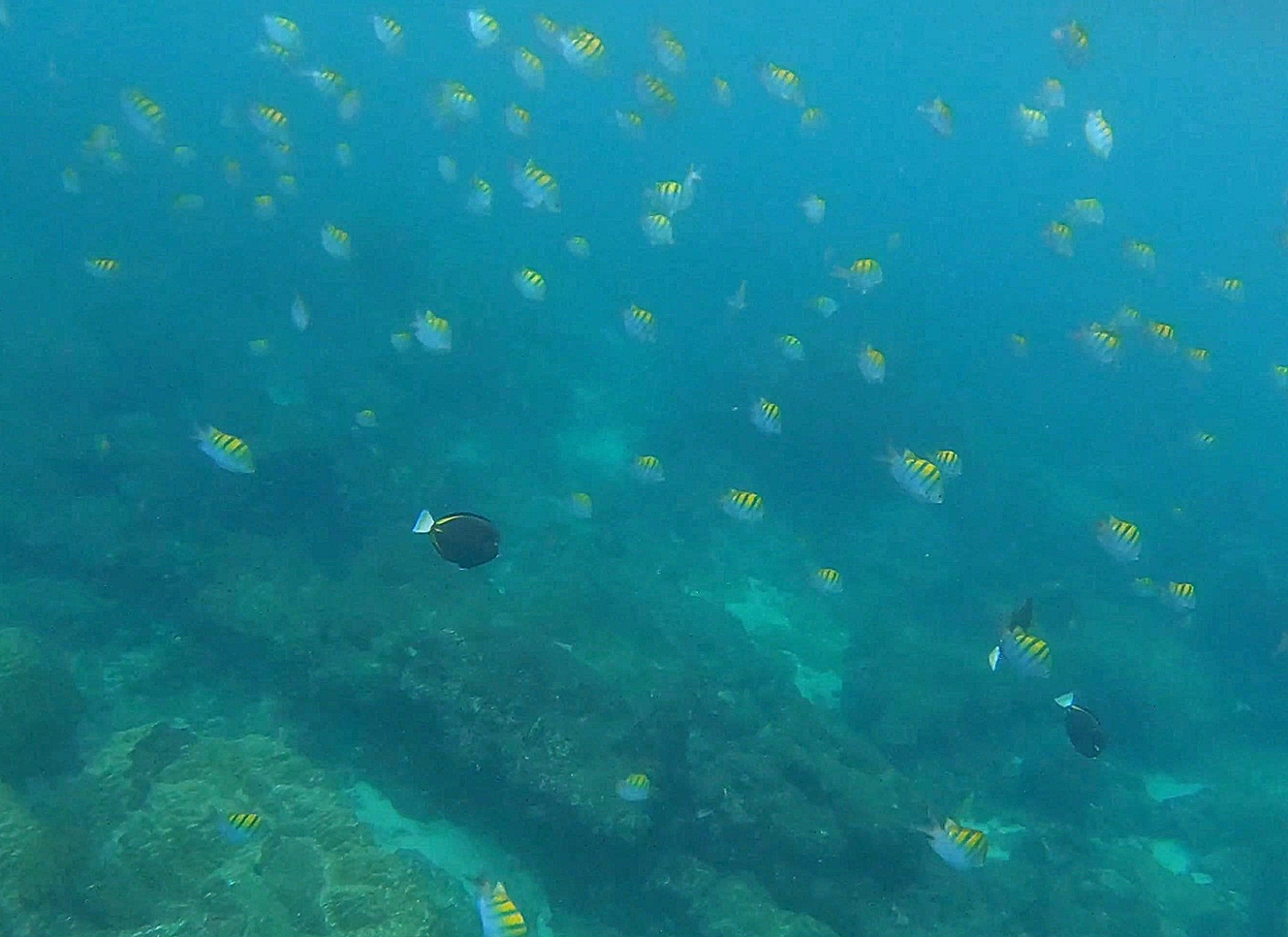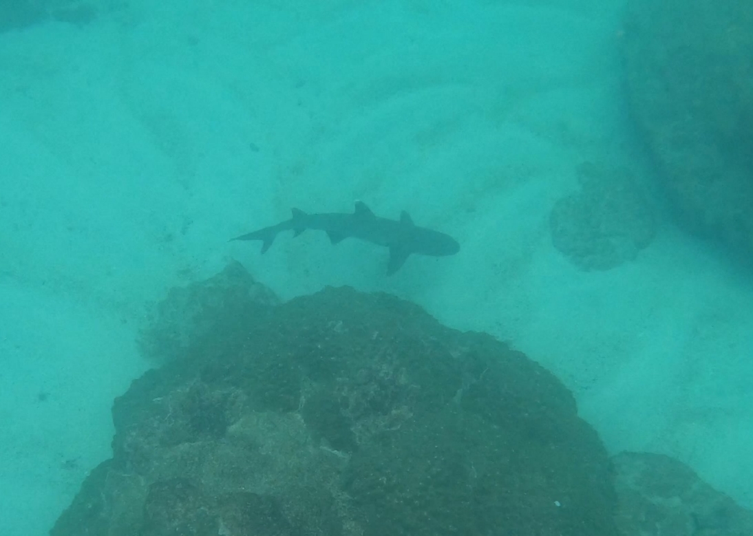 Nous nageons donc toute la matinée dans deux sites différents. Nous suivons le guide qui nous indique les lieux intéressants en termes de faune marine. Nous voyons un grand nombre de poissons différent, un serpent marin, des requins à pointes blanches et plusieurs tortues.