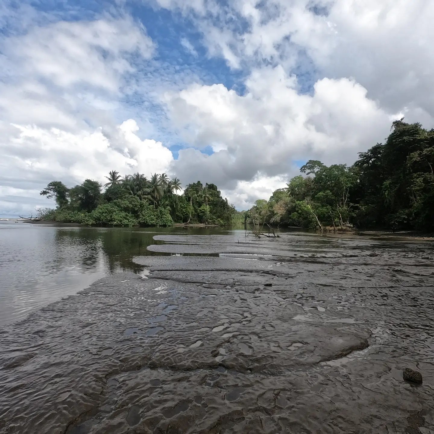Arrivés à Sierpe, nous trouvons facilement le restaurant La Perla où nous attendent les conducteurs des bateaux. Nous embarquons donc sur un petit bateau pour une traversée d’environ une heure, d’abord sur la rivière puis dans la mer jusqu’à la petite ville de Bahia Drake. Nous arrivons dans la baie, nous débarquons les pieds dans l’eau.